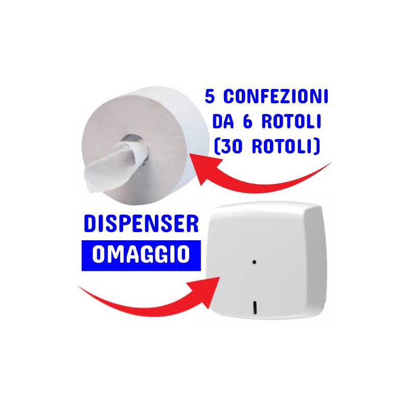 Cod. 820821 - Kit offerta 5 confezioni da 6 rotoli di carta igienica mini jumbo ad estrazione centrale + dispenser OMAGGIO.