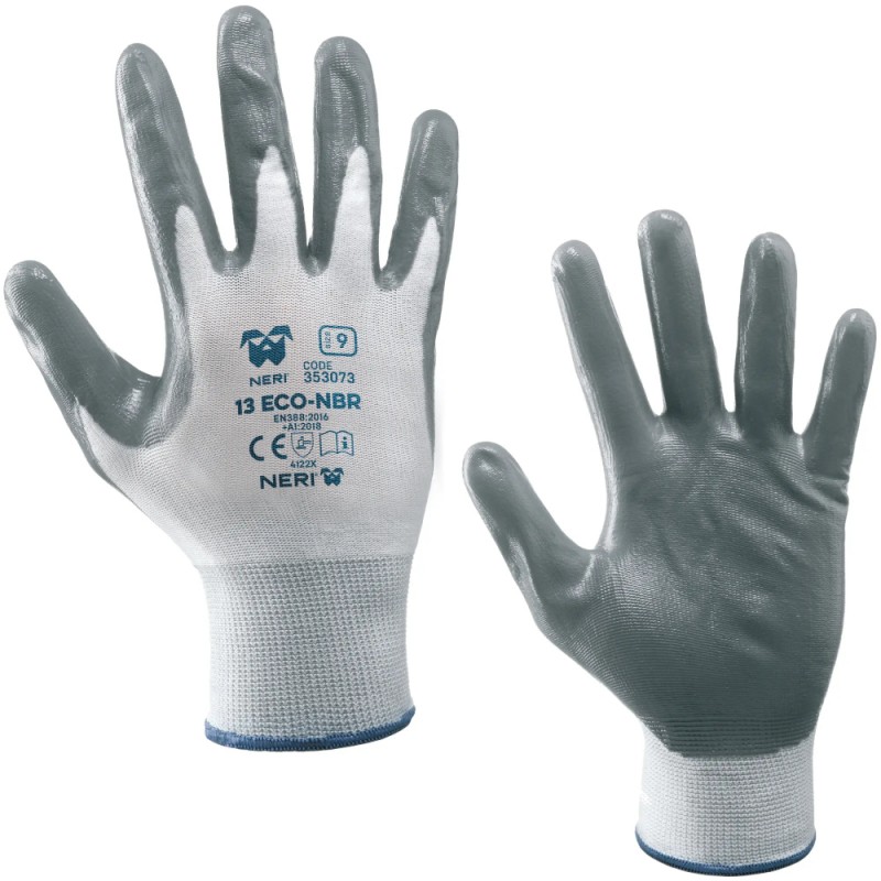 Cod. 353075 Guanti a filo continuo 100% nylon / nitrile, palmo ricoperto in nitrile, dorso traspirante, polso elasticizzato, forma ergonomica, assenza di cuciture, ottimo comfort di calzata.
