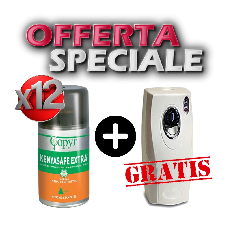 Con l'acquisto di 12 bombole di insetticida KENYASAFE EXTRA ad elavata AZIONE ABBATTENTE su mosche, zanzare e insetti, il praticissimo EROGATORE AUTOMATICO programmabile COPYRMATIC® Evolution TE LO REGALIAMO NOI. |