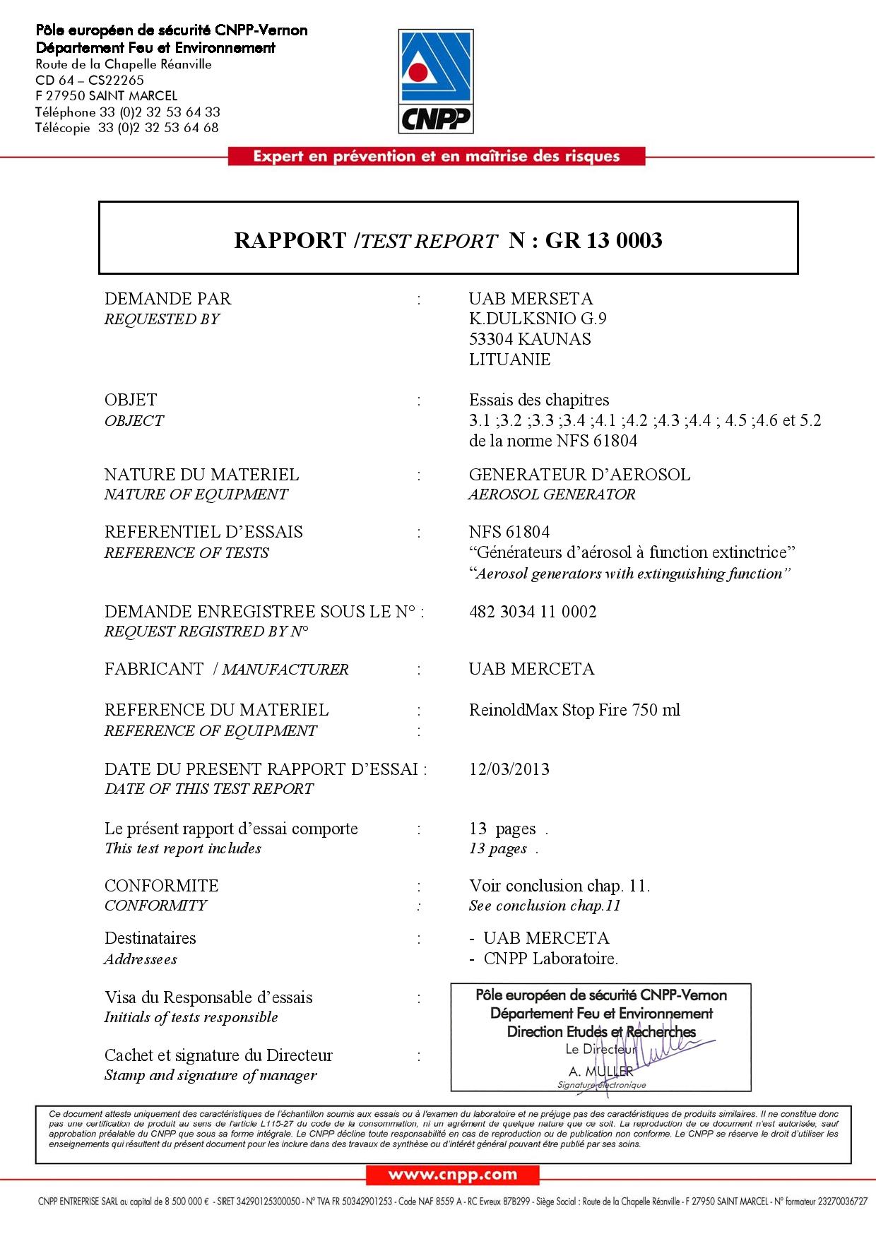 Lo standard è registrato presso il Dipartimento di standardizzazione lituano. Numero di registrazione. 4759. Data di registrazione: 24.09.2008. Lo standard è coordinato con il Centro di ricerca antincendio PGAD presso il Ministero degli affari interni della Repubblica di Lituania TOP FIRE SPRAY ESTINGUENTE ANTINCENDIO 750 ml è stato testato nel laboratorio MPA di Dresda secondo BS 6165: 2002 e. secondo EN3-7: 2007. Rapporto n. 2009-F-2451.