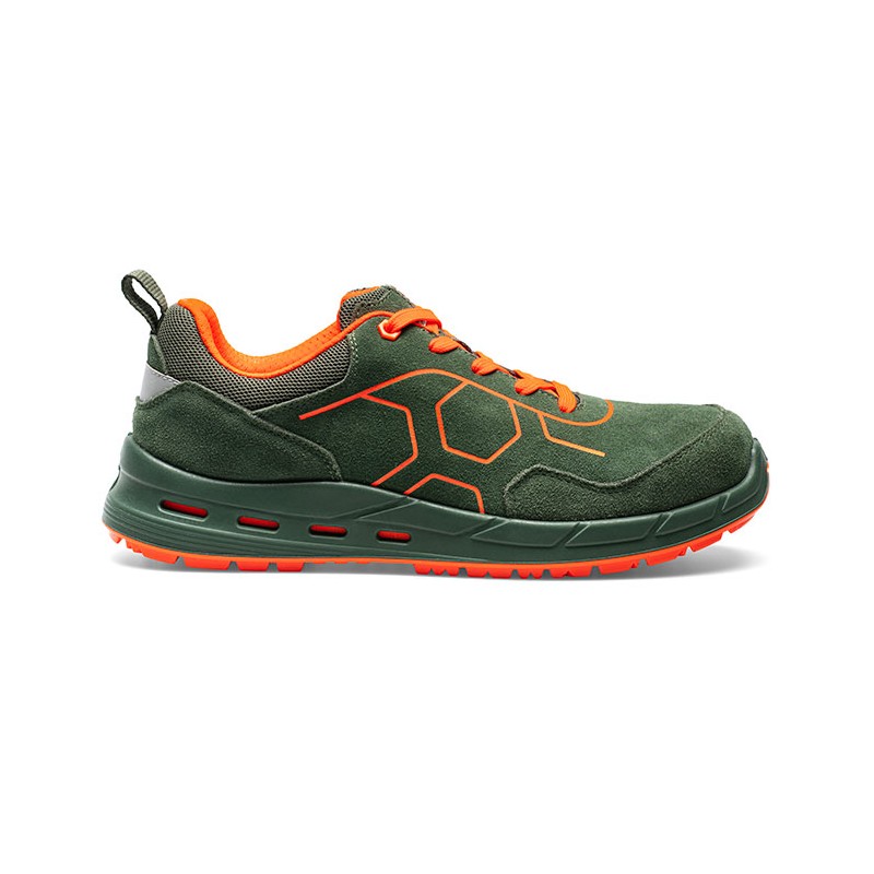 Cod. 3R182T - Scarpa antinfortunistica bassa forata, in pelle groppone scamosciato spessore 1,8-2,0 mm. Fodera in tessuto altamente traspirante e resistente all' abrasione. Calzatura con inserto in tessuto rifrangente. Linguetta morbida foderata. CE UNI EN ISO 20345:2012 S1P SRC